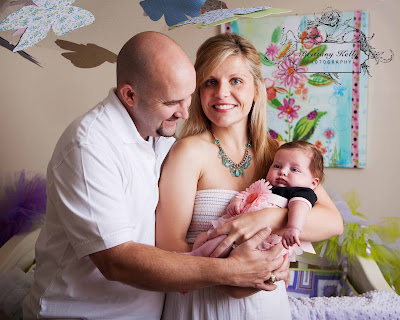 The Lathrops have a new 4 month old baby girl and they had me come to their home to photograph them. It was a bit hot and humid on their front porch so we didn't stay there long. Luckily they have the most adorable nursery for their daughter that is themed with purple, green and butterflies. It's so photogenic that is was the perfect location for photos. I brought my studio lights to make up for the lack of light and they worked out perfectly.